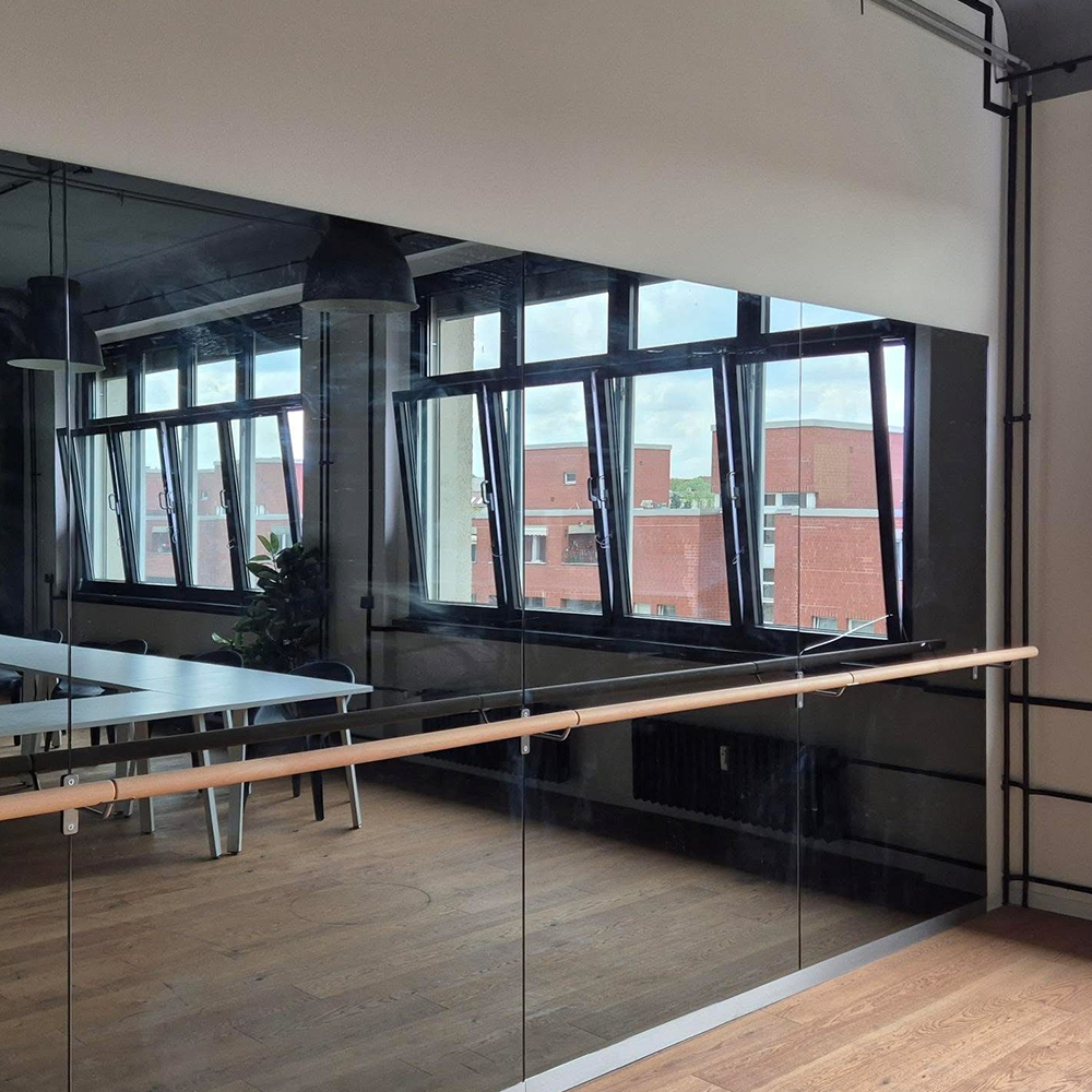 Unser ehemaliges Tanzstudio bietet genau das: Ausgestattet mit einer grossen Fensterfront, die den Raum mit Tageslicht durchflutet, einer verspiegelten Wand und einer Balletstange, eignet er sich perfekt für Yogakurse, Sport- oder Tanztrainings.